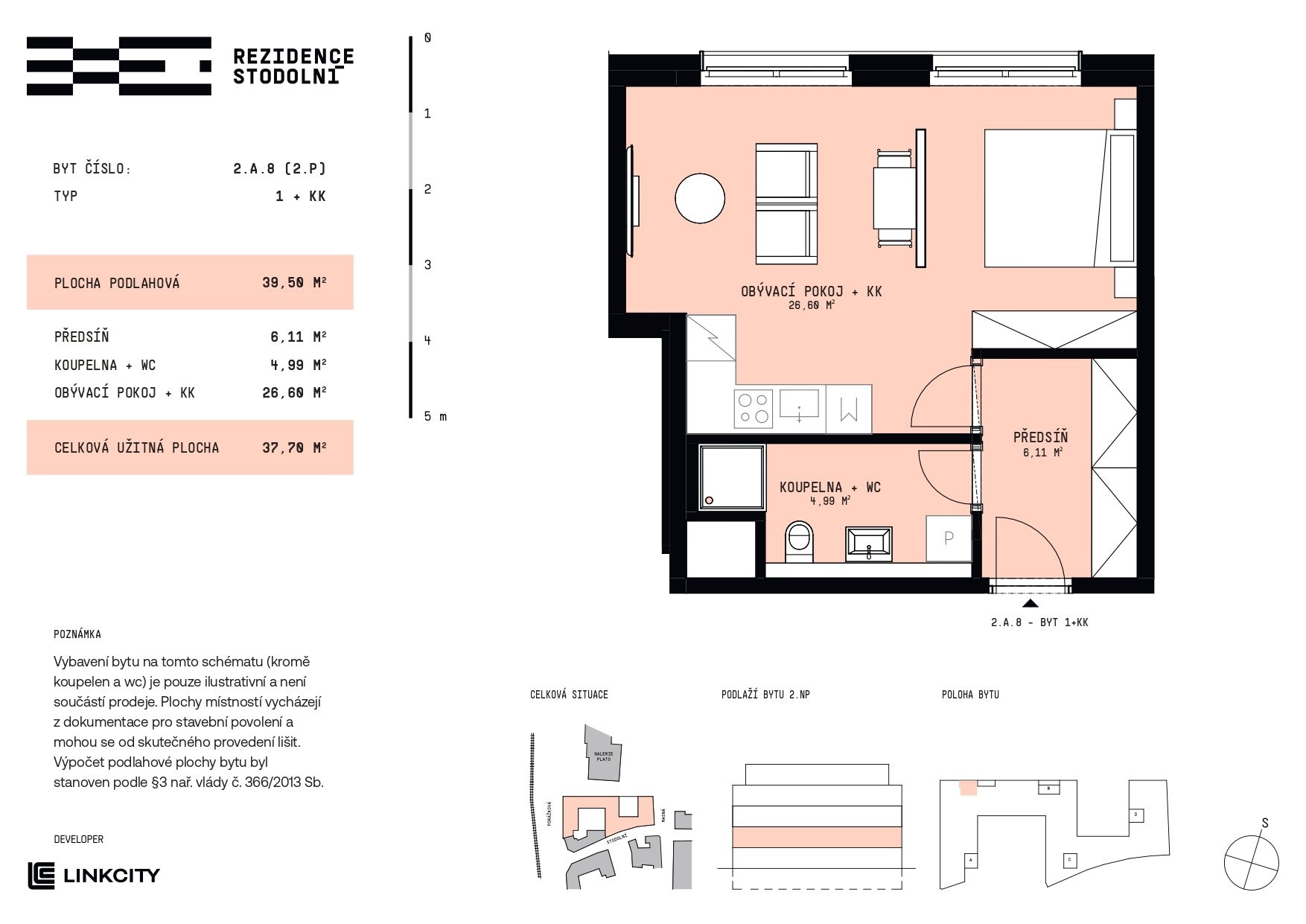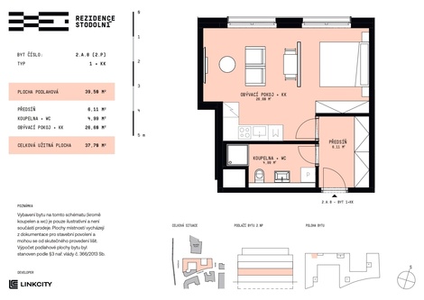 Nabízíme k prodeji byt 1+kk v Rezidenci Stodolní. Byt 2.A.8 o velikosti 39,50 m2 se nachází v 2. nadzemním podlaží. Díky rekuperaci vzduchu a dobře izolovaným oknům bude poskytovat maximálně možný klidný zážitek z bydlení. Dispozice zahrnuje prostorný obývací pokoj s kuchyní, koupelnu spojenou s WC a praktickou předsíň s prostorem pro úložné systémy. Rezidence Stodolní představuje nejmodernější bytový projekt v Ostravě z dílny ateliéru Bogle Architects a je součástí prestižní proměny centra města. Nová rezidenční čtvrť s pěší zónou a Galerií PLATO v bezprostřední blízkosti nabízí kombinaci moderního bydlení, klidu a vysokého standardu bezpečí. Nabízený byt je vhodný pro moderní pár nebo jako investice s výborným potenciálem. Byt je vybaven plovoucími podlahami, přičemž barevné provedení standardu lze přizpůsobit přání klienta. Kombinace kvalitních oken s trojitým zasklením, solární elektrárny a centrálního horkovodního vytápění zajišťuje nízké provozní náklady. Budovy jsou dle energetického štítku zařazeny do kategorie „B - vysoce úsporné“. V podzemních garážích Rezidence Stodolní je k dispozici přibližně 120 parkovacích míst. Nabízena budou samostatná parkovací stání, stání se sklepní kójí i samostatné sklepy. Parkovací místa a sklepy nejsou zahrnuty v ceně bytu. Garáže budou vybaveny přípravou pro dobíjení elektromobilů, což zaručuje pohodlí i do budoucna. Výstavba projektu Rezidence Stodolní je již zahájena, kolaudace je plánována na konec roku 2027. Pro doplňující informace nás můžete kontaktovat telefonicky nebo osobně v kancelářích Organica - Scott-Weber, náměstí Biskupa Bruna 3399/5, 702 00 Moravská Ostrava. Schůzky si prosím rezervujte předem e-mailem nebo telefonicky. Těšíme se na setkání s Vámi.