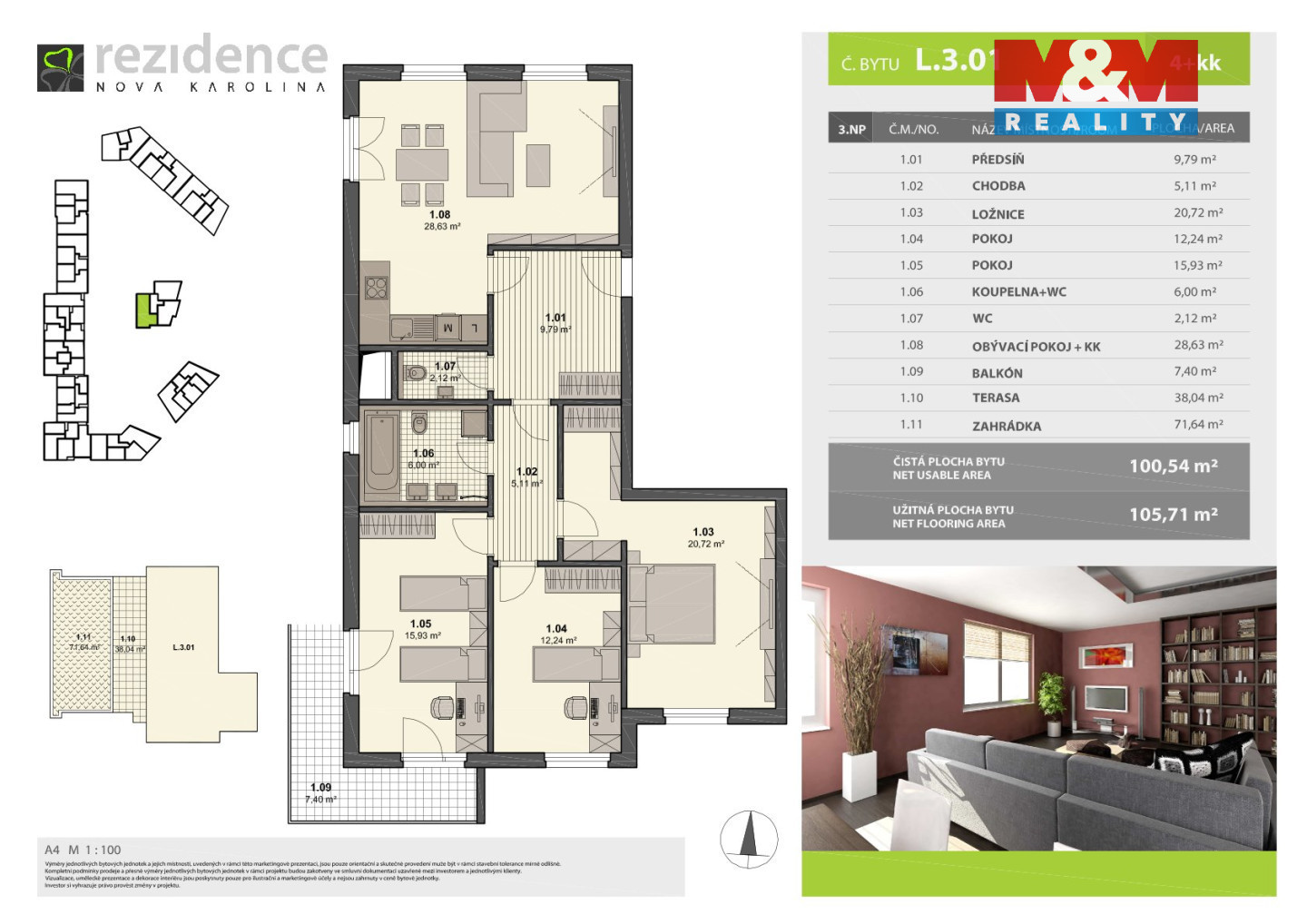 Nabízíme k prodeji nadstandardní velký byt 4+kk o užitné ploše 105 m2, který se nachází ve třetím patře panelového domu v bytovém komplexu Rezidence Nová Karolina s terasou a zahradou o celkové ploše 100 m2.. Byt je vybaven kuchyňskou linkou včetně vestavěných spotřebičů s přístupem na balkon, terasu s travnatou zahradou, kde si můžete vychutnat zasloužený odpočinek. Jednou z hlavních výhod této nemovitosti je parkovací místo v podzemní garáži, což vám ušetří starosti s parkováním. V celém bytě jsou plovoucí podlahy, v koupelně a na WC moderní obklady. Byt se nabízí k prodeji i platícím nájemníkem (smlouva do 31.10.2027).